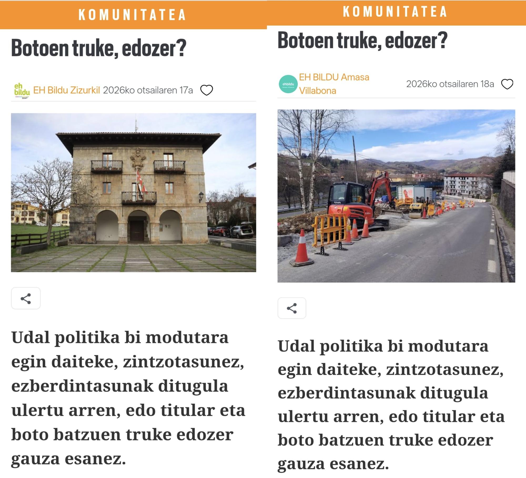 Amasa Villabonako udal talde jeltzaleak EH Bilduren zorroztasun eta lan politiko falta salatu du, azken egunotan Amasa-Villabonan eta Zizurkilen izenburu eta azpititulu berarekin komunikatutako bi komunikatu zabaldu dituela egiaztatu ondoren, mezu bera errepikatuz, nahiz eta udalerri desberdinak izan, testuinguru eta errealitate propioekin.