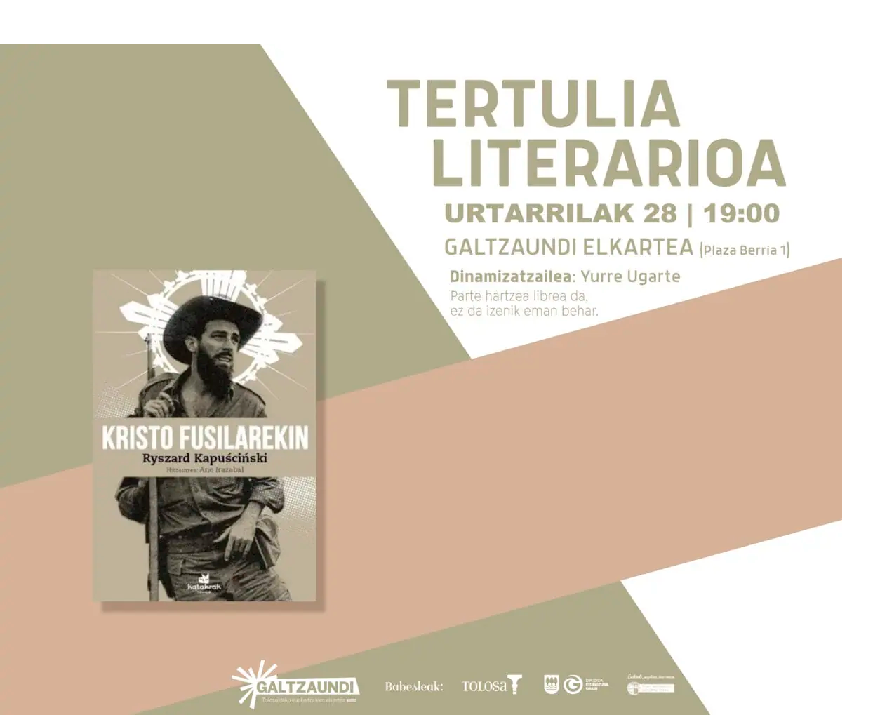 Tertulia literarioa 19:00etan hasiko da Galtzaundin (Plaza Berria, 1) eta Yurre Ugarte izango da saioaren dinamizatzailea.