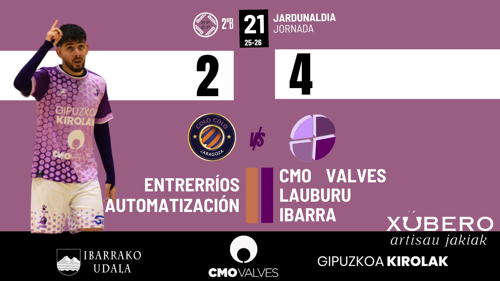 Hor sortu zen CMO VALVES LAUBURU KE IBARRA onena. Bisitarien nagusitasuna, erlojuiaren zehaztasunez zirikatutako jokaldi eta gero eta arrisku-sentsazio handiagoa. Rafak, 30. minutuan, markagailua irauli zuen. Victorek, bost minutu geroago, errenta handitu zuen, baina epailearen akats batean bere atean sartu zuen.