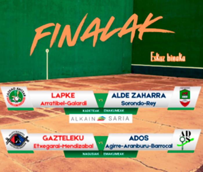 Elolak eta Perezek ( LAPKE) Etxeberriaren eta Landaen (Tolosa) aurka jokatuko dute Jubenil mailako finalean eta ondoren, Nagusietan LAPKEko Garmediak eta Zubizarretak Tartaloetxeko Azketa eta Elizegiren kontra.