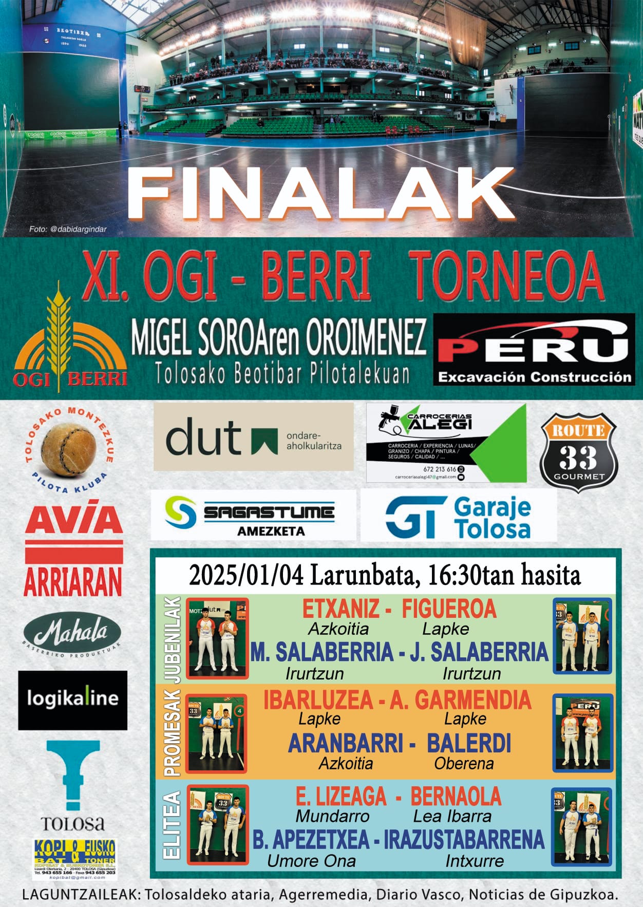 Larunbatean, arratsaldeko 16:30ean jokatuko dira finalak Tolosako Beotibar pilotalekuan. Partiduak ikusteko 10 euro ordaindu beharko dira eta sarrerarekin bi lagunentzako bazkaria eta astebukaera bat autokarabanan zozketatuko dituzte.