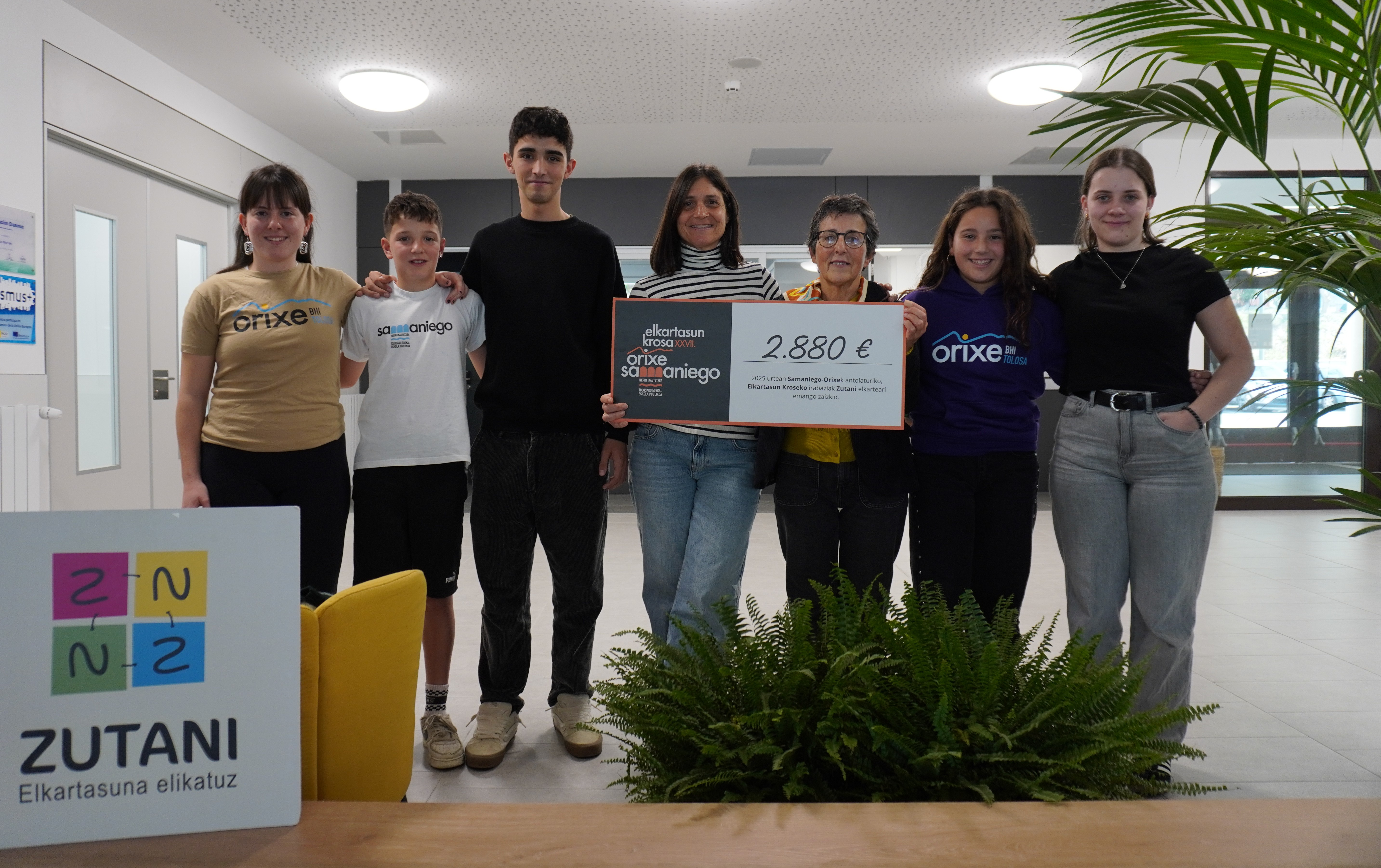 Samaniego Ikastetxeko eta Orixe BHIko ordezkariek aste honetan entregatu diote Elkartasun Krosean bildutako dirua Zutani elkarteari. Antolatzaileek elkarte honi eman diote dirua, "egiten duen lan sozial baliotsuari ekarpena egiteko asmoz". Bi ikastetxeek eskerrak eman nahi dizkiete ekimenean parte hartu duten ikasle, irakasle, familia eta herritarrei. Horrelako ekimenek balio hezitzaile handia dutela nabarmendu dute, "elkartasunaren eta gizartearekiko konpromisoaren garrantzia azpimarratzen dute."