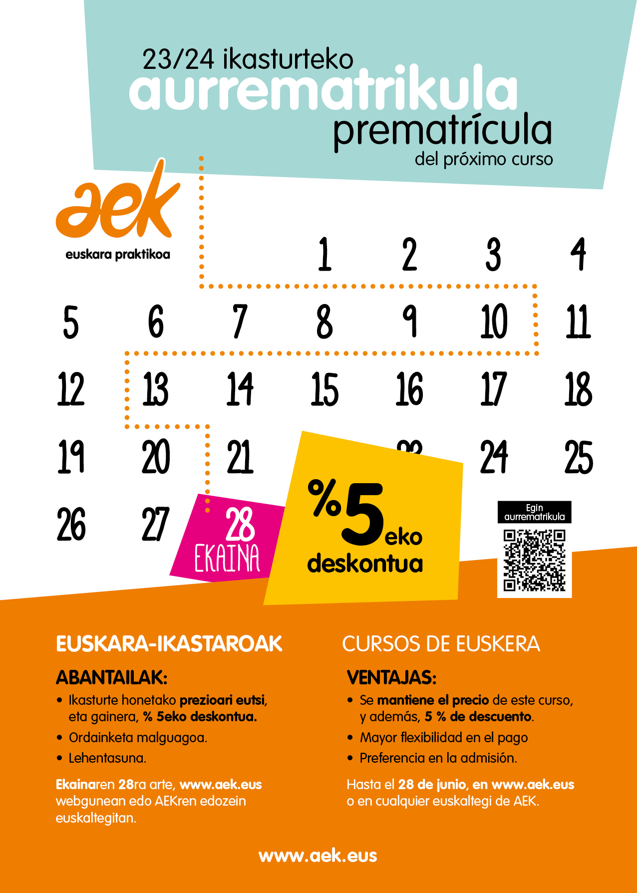 Izen emateak eta informazioa: AEKren edozein euskaltegitan, edo 673 200 100 eta 946 464 000 telefono zenbakietan. Horrez gain, baita www.aek.eus webgunean ere.
