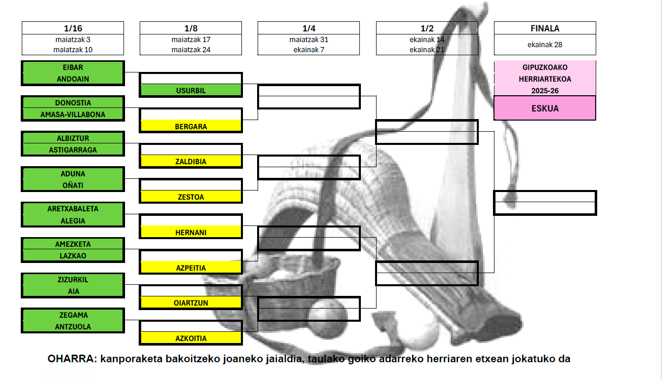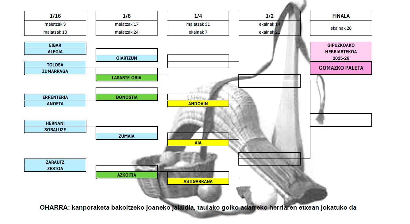 Gomazko paletari dagokionean, final hamaseirenetan Tolosak Zumarraga hartuko du lehen partidan, Anoetak Errenterian jokatuko du eta Alegiak Eibarren. Kasu honetan ere maiatzako lehenengo bi ostiraletan jokatuko dira lehen kanporaketak. Eskualdeko hiru partaideak txapelketaren goiko adarretik egingo dute finalerako bidea, final laurdenetan etorri daiteke Alegia eta Tolosaren arteko derbia.